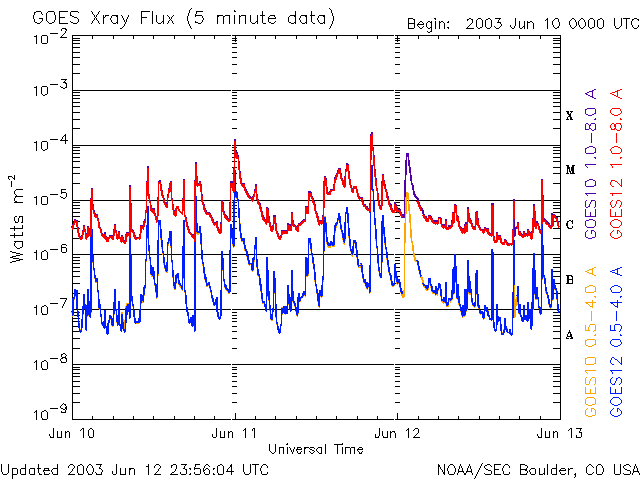The operational data in the graph above has been modified to remove the scaling factor that has been applied by the Space Weather Prediction Center (SWPC). Because of the SWPC scaling factor in the operational data, flare indices for the operational data were reported as 42% smaller than for the science quality data. The scaling factor has also been removed from the solar flare list to reflect the true physical units.