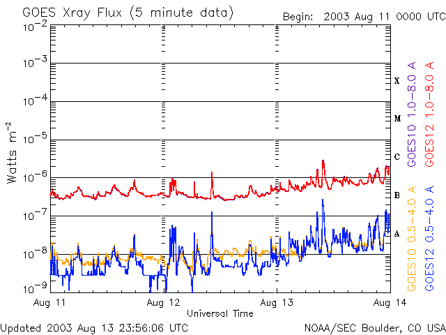 The operational data in the graph above has been modified to remove the scaling factor that has been applied by the Space Weather Prediction Center (SWPC). Because of the SWPC scaling factor in the operational data, flare indices for the operational data were reported as 42% smaller than for the science quality data. The scaling factor has also been removed from the solar flare list to reflect the true physical units.