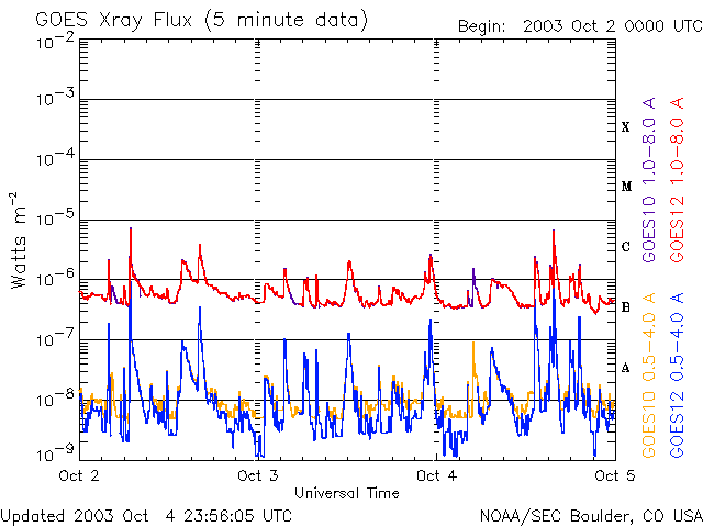 The operational data in the graph above has been modified to remove the scaling factor that has been applied by the Space Weather Prediction Center (SWPC). Because of the SWPC scaling factor in the operational data, flare indices for the operational data were reported as 42% smaller than for the science quality data. The scaling factor has also been removed from the solar flare list to reflect the true physical units.