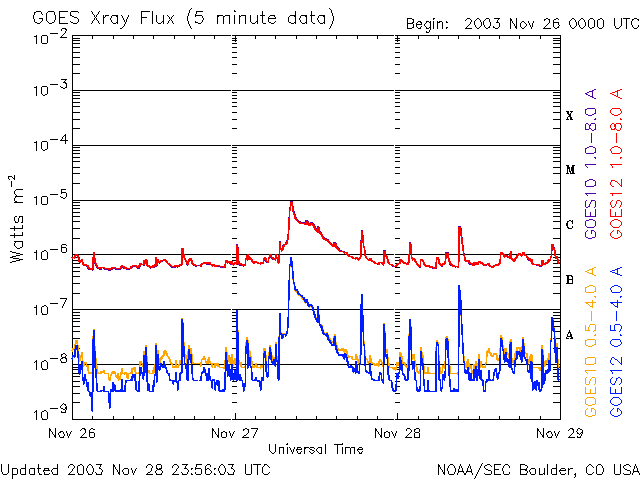The operational data in the graph above has been modified to remove the scaling factor that has been applied by the Space Weather Prediction Center (SWPC). Because of the SWPC scaling factor in the operational data, flare indices for the operational data were reported as 42% smaller than for the science quality data. The scaling factor has also been removed from the solar flare list to reflect the true physical units.