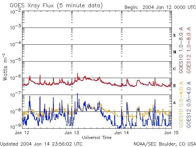 The operational data in the graph above has been modified to remove the scaling factor that has been applied by the Space Weather Prediction Center (SWPC). Because of the SWPC scaling factor in the operational data, flare indices for the operational data were reported as 42% smaller than for the science quality data. The scaling factor has also been removed from the solar flare list to reflect the true physical units.