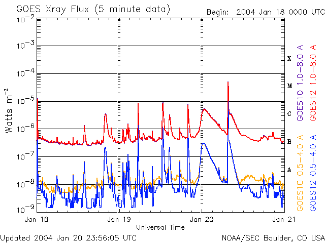 The operational data in the graph above has been modified to remove the scaling factor that has been applied by the Space Weather Prediction Center (SWPC). Because of the SWPC scaling factor in the operational data, flare indices for the operational data were reported as 42% smaller than for the science quality data. The scaling factor has also been removed from the solar flare list to reflect the true physical units.