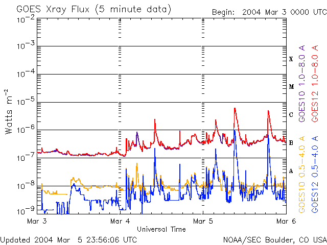 The operational data in the graph above has been modified to remove the scaling factor that has been applied by the Space Weather Prediction Center (SWPC). Because of the SWPC scaling factor in the operational data, flare indices for the operational data were reported as 42% smaller than for the science quality data. The scaling factor has also been removed from the solar flare list to reflect the true physical units.