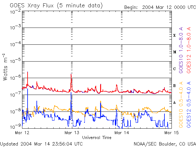 The operational data in the graph above has been modified to remove the scaling factor that has been applied by the Space Weather Prediction Center (SWPC). Because of the SWPC scaling factor in the operational data, flare indices for the operational data were reported as 42% smaller than for the science quality data. The scaling factor has also been removed from the solar flare list to reflect the true physical units.