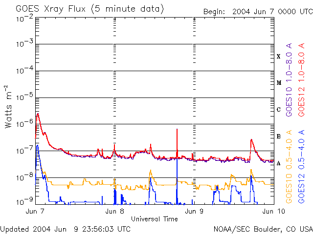 The operational data in the graph above has been modified to remove the scaling factor that has been applied by the Space Weather Prediction Center (SWPC). Because of the SWPC scaling factor in the operational data, flare indices for the operational data were reported as 42% smaller than for the science quality data. The scaling factor has also been removed from the solar flare list to reflect the true physical units.