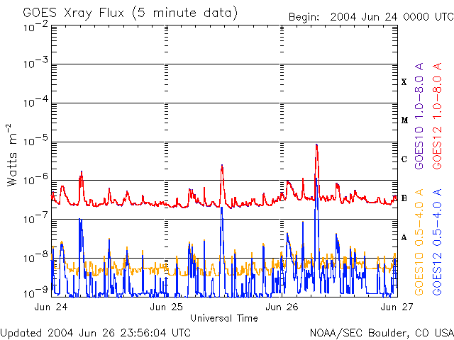 The operational data in the graph above has been modified to remove the scaling factor that has been applied by the Space Weather Prediction Center (SWPC). Because of the SWPC scaling factor in the operational data, flare indices for the operational data were reported as 42% smaller than for the science quality data. The scaling factor has also been removed from the solar flare list to reflect the true physical units.