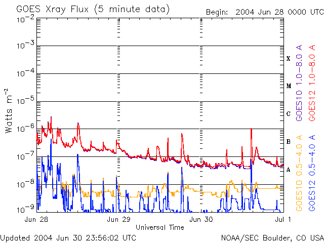 The operational data in the graph above has been modified to remove the scaling factor that has been applied by the Space Weather Prediction Center (SWPC). Because of the SWPC scaling factor in the operational data, flare indices for the operational data were reported as 42% smaller than for the science quality data. The scaling factor has also been removed from the solar flare list to reflect the true physical units.