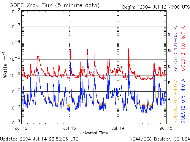 The operational data in the graph above has been modified to remove the scaling factor that has been applied by the Space Weather Prediction Center (SWPC). Because of the SWPC scaling factor in the operational data, flare indices for the operational data were reported as 42% smaller than for the science quality data. The scaling factor has also been removed from the solar flare list to reflect the true physical units.