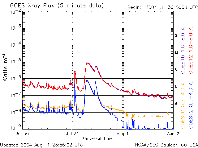 The operational data in the graph above has been modified to remove the scaling factor that has been applied by the Space Weather Prediction Center (SWPC). Because of the SWPC scaling factor in the operational data, flare indices for the operational data were reported as 42% smaller than for the science quality data. The scaling factor has also been removed from the solar flare list to reflect the true physical units.