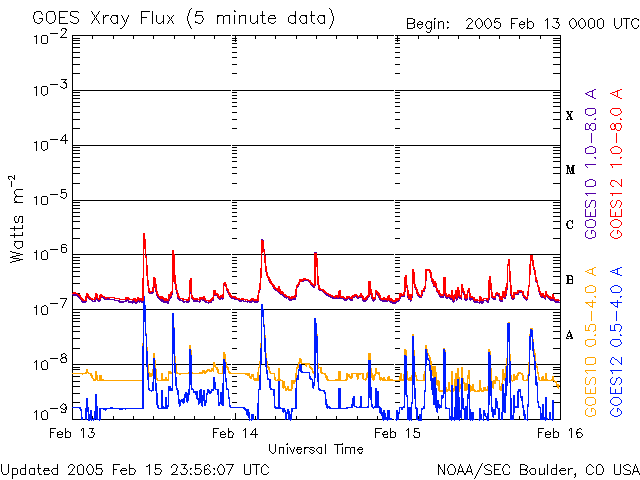 The operational data in the graph above has been modified to remove the scaling factor that has been applied by the Space Weather Prediction Center (SWPC). Because of the SWPC scaling factor in the operational data, flare indices for the operational data were reported as 42% smaller than for the science quality data. The scaling factor has also been removed from the solar flare list to reflect the true physical units.