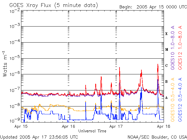 The operational data in the graph above has been modified to remove the scaling factor that has been applied by the Space Weather Prediction Center (SWPC). Because of the SWPC scaling factor in the operational data, flare indices for the operational data were reported as 42% smaller than for the science quality data. The scaling factor has also been removed from the solar flare list to reflect the true physical units.