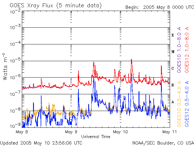 The operational data in the graph above has been modified to remove the scaling factor that has been applied by the Space Weather Prediction Center (SWPC). Because of the SWPC scaling factor in the operational data, flare indices for the operational data were reported as 42% smaller than for the science quality data. The scaling factor has also been removed from the solar flare list to reflect the true physical units.