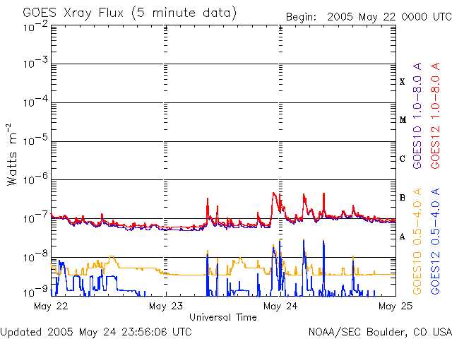 The operational data in the graph above has been modified to remove the scaling factor that has been applied by the Space Weather Prediction Center (SWPC). Because of the SWPC scaling factor in the operational data, flare indices for the operational data were reported as 42% smaller than for the science quality data. The scaling factor has also been removed from the solar flare list to reflect the true physical units.