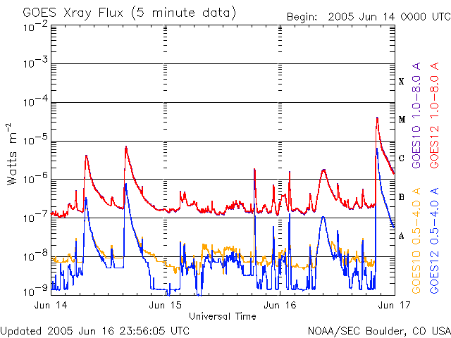 The operational data in the graph above has been modified to remove the scaling factor that has been applied by the Space Weather Prediction Center (SWPC). Because of the SWPC scaling factor in the operational data, flare indices for the operational data were reported as 42% smaller than for the science quality data. The scaling factor has also been removed from the solar flare list to reflect the true physical units.