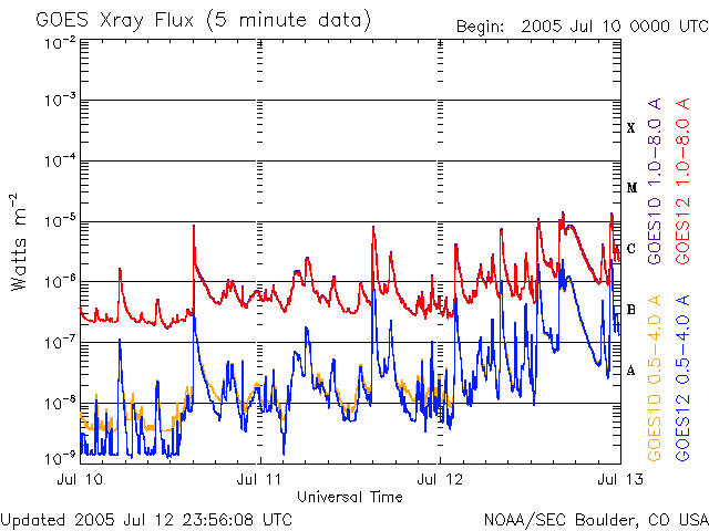 The operational data in the graph above has been modified to remove the scaling factor that has been applied by the Space Weather Prediction Center (SWPC). Because of the SWPC scaling factor in the operational data, flare indices for the operational data were reported as 42% smaller than for the science quality data. The scaling factor has also been removed from the solar flare list to reflect the true physical units.