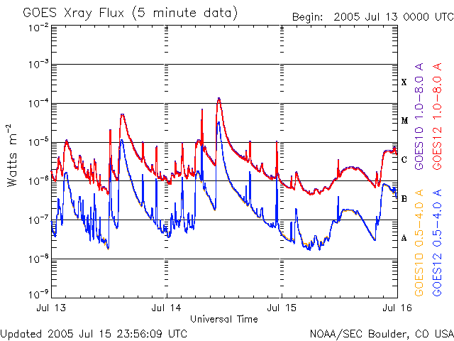 The operational data in the graph above has been modified to remove the scaling factor that has been applied by the Space Weather Prediction Center (SWPC). Because of the SWPC scaling factor in the operational data, flare indices for the operational data were reported as 42% smaller than for the science quality data. The scaling factor has also been removed from the solar flare list to reflect the true physical units.