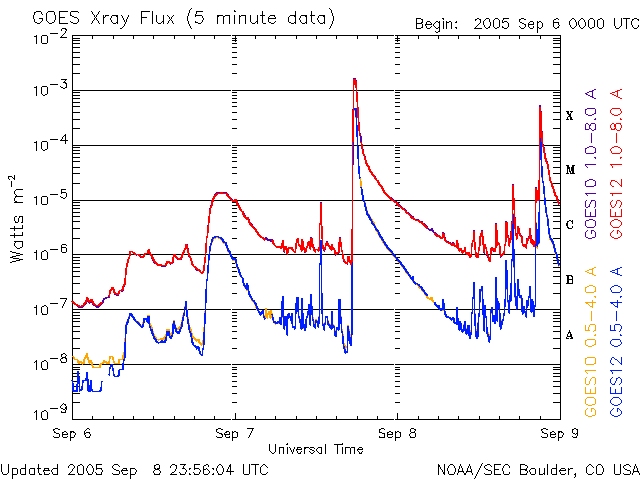 The operational data in the graph above has been modified to remove the scaling factor that has been applied by the Space Weather Prediction Center (SWPC). Because of the SWPC scaling factor in the operational data, flare indices for the operational data were reported as 42% smaller than for the science quality data. The scaling factor has also been removed from the solar flare list to reflect the true physical units.