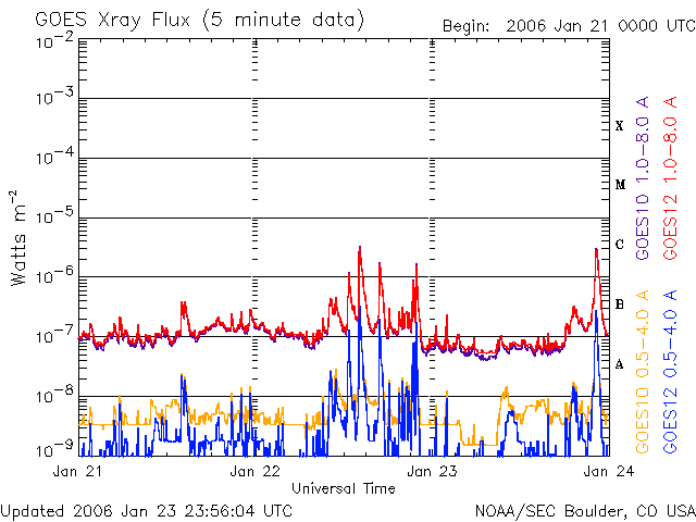 The operational data in the graph above has been modified to remove the scaling factor that has been applied by the Space Weather Prediction Center (SWPC). Because of the SWPC scaling factor in the operational data, flare indices for the operational data were reported as 42% smaller than for the science quality data. The scaling factor has also been removed from the solar flare list to reflect the true physical units.