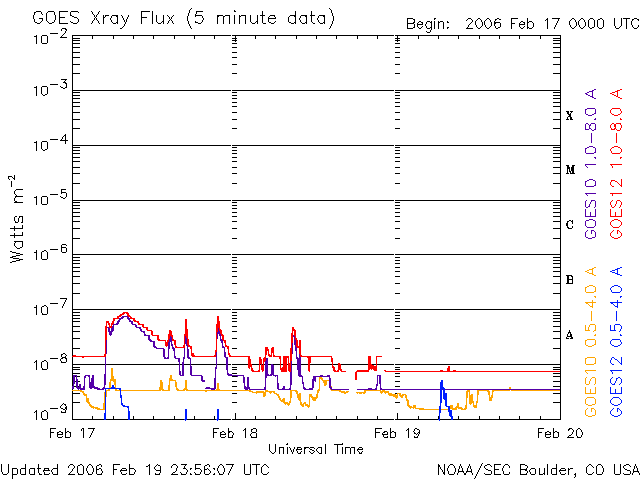 The operational data in the graph above has been modified to remove the scaling factor that has been applied by the Space Weather Prediction Center (SWPC). Because of the SWPC scaling factor in the operational data, flare indices for the operational data were reported as 42% smaller than for the science quality data. The scaling factor has also been removed from the solar flare list to reflect the true physical units.