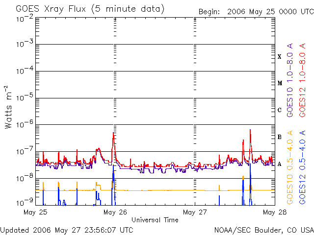 The operational data in the graph above has been modified to remove the scaling factor that has been applied by the Space Weather Prediction Center (SWPC). Because of the SWPC scaling factor in the operational data, flare indices for the operational data were reported as 42% smaller than for the science quality data. The scaling factor has also been removed from the solar flare list to reflect the true physical units.