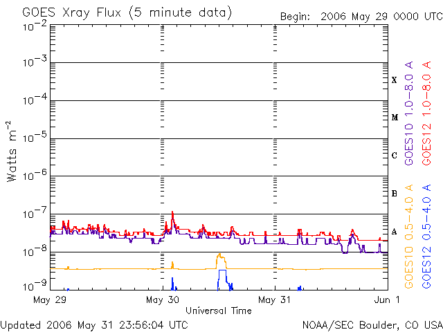 The operational data in the graph above has been modified to remove the scaling factor that has been applied by the Space Weather Prediction Center (SWPC). Because of the SWPC scaling factor in the operational data, flare indices for the operational data were reported as 42% smaller than for the science quality data. The scaling factor has also been removed from the solar flare list to reflect the true physical units.