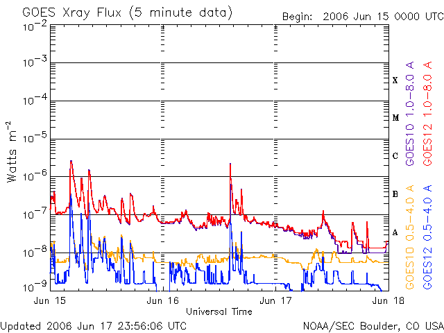 The operational data in the graph above has been modified to remove the scaling factor that has been applied by the Space Weather Prediction Center (SWPC). Because of the SWPC scaling factor in the operational data, flare indices for the operational data were reported as 42% smaller than for the science quality data. The scaling factor has also been removed from the solar flare list to reflect the true physical units.