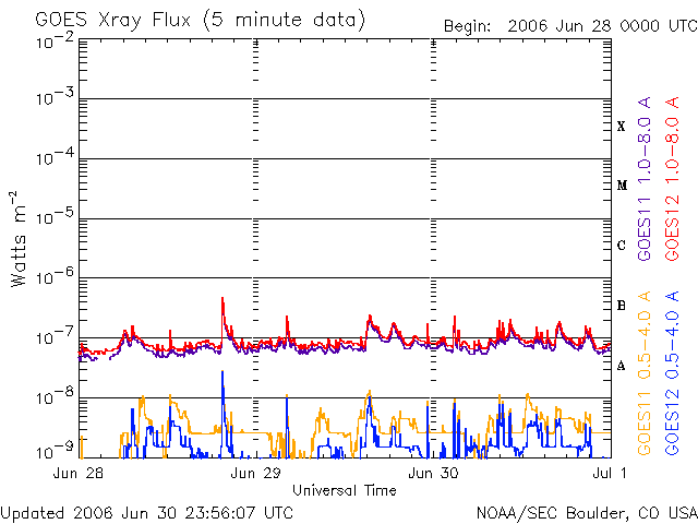 The operational data in the graph above has been modified to remove the scaling factor that has been applied by the Space Weather Prediction Center (SWPC). Because of the SWPC scaling factor in the operational data, flare indices for the operational data were reported as 42% smaller than for the science quality data. The scaling factor has also been removed from the solar flare list to reflect the true physical units.