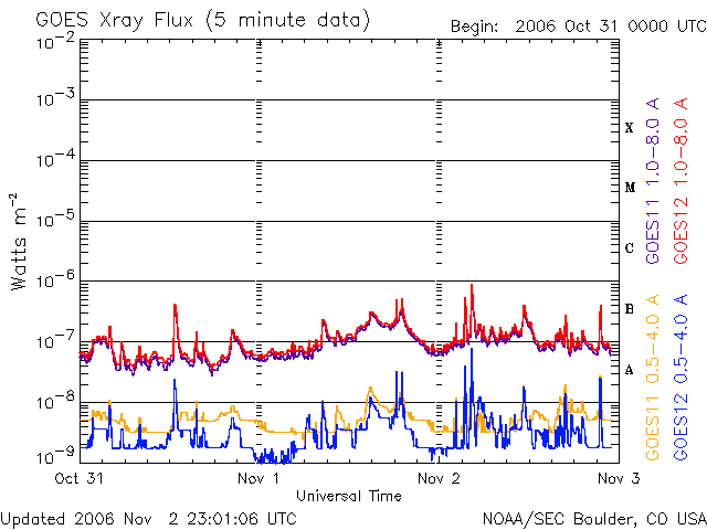 The operational data in the graph above has been modified to remove the scaling factor that has been applied by the Space Weather Prediction Center (SWPC). Because of the SWPC scaling factor in the operational data, flare indices for the operational data were reported as 42% smaller than for the science quality data. The scaling factor has also been removed from the solar flare list to reflect the true physical units.