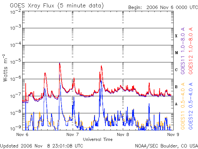 The operational data in the graph above has been modified to remove the scaling factor that has been applied by the Space Weather Prediction Center (SWPC). Because of the SWPC scaling factor in the operational data, flare indices for the operational data were reported as 42% smaller than for the science quality data. The scaling factor has also been removed from the solar flare list to reflect the true physical units.