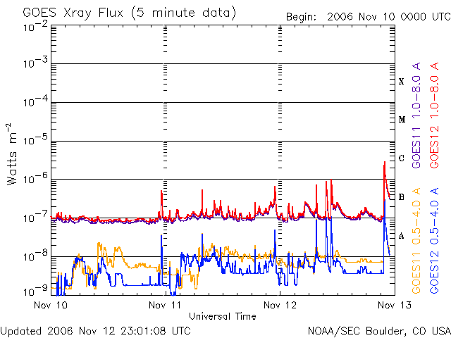 The operational data in the graph above has been modified to remove the scaling factor that has been applied by the Space Weather Prediction Center (SWPC). Because of the SWPC scaling factor in the operational data, flare indices for the operational data were reported as 42% smaller than for the science quality data. The scaling factor has also been removed from the solar flare list to reflect the true physical units.