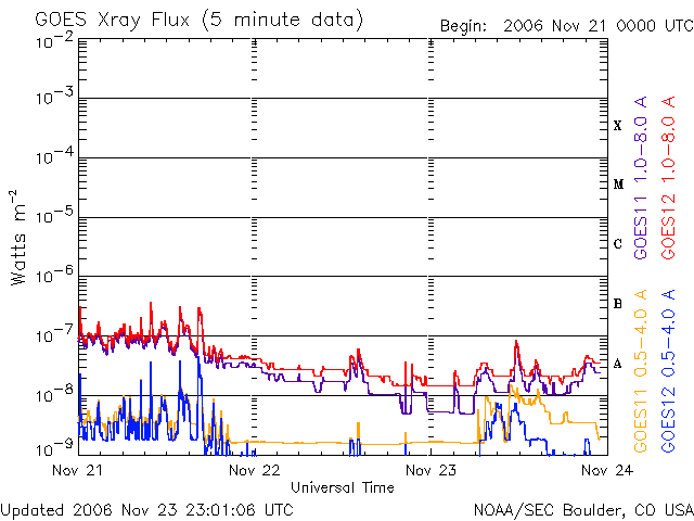 The operational data in the graph above has been modified to remove the scaling factor that has been applied by the Space Weather Prediction Center (SWPC). Because of the SWPC scaling factor in the operational data, flare indices for the operational data were reported as 42% smaller than for the science quality data. The scaling factor has also been removed from the solar flare list to reflect the true physical units.