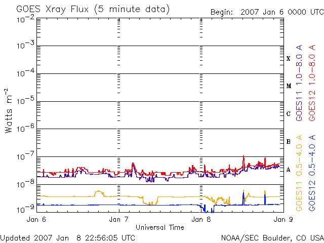 The operational data in the graph above has been modified to remove the scaling factor that has been applied by the Space Weather Prediction Center (SWPC). Because of the SWPC scaling factor in the operational data, flare indices for the operational data were reported as 42% smaller than for the science quality data. The scaling factor has also been removed from the solar flare list to reflect the true physical units.