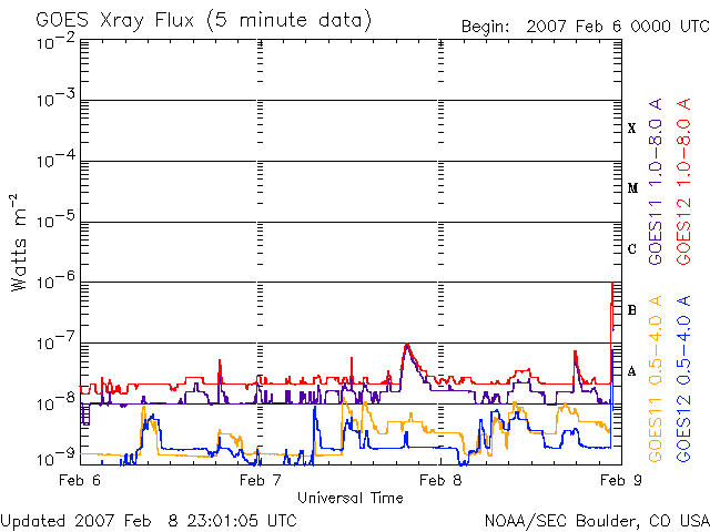 The operational data in the graph above has been modified to remove the scaling factor that has been applied by the Space Weather Prediction Center (SWPC). Because of the SWPC scaling factor in the operational data, flare indices for the operational data were reported as 42% smaller than for the science quality data. The scaling factor has also been removed from the solar flare list to reflect the true physical units.