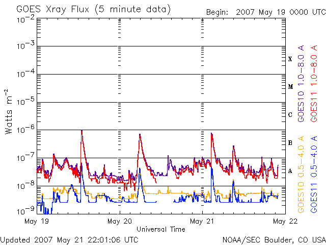 The operational data in the graph above has been modified to remove the scaling factor that has been applied by the Space Weather Prediction Center (SWPC). Because of the SWPC scaling factor in the operational data, flare indices for the operational data were reported as 42% smaller than for the science quality data. The scaling factor has also been removed from the solar flare list to reflect the true physical units.