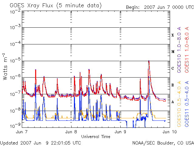 The operational data in the graph above has been modified to remove the scaling factor that has been applied by the Space Weather Prediction Center (SWPC). Because of the SWPC scaling factor in the operational data, flare indices for the operational data were reported as 42% smaller than for the science quality data. The scaling factor has also been removed from the solar flare list to reflect the true physical units.