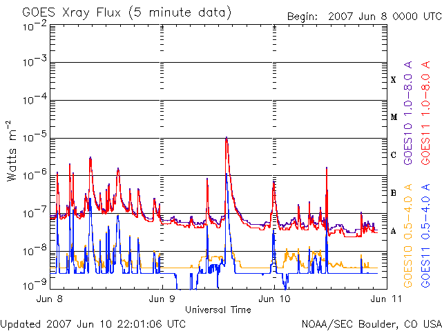 The operational data in the graph above has been modified to remove the scaling factor that has been applied by the Space Weather Prediction Center (SWPC). Because of the SWPC scaling factor in the operational data, flare indices for the operational data were reported as 42% smaller than for the science quality data. The scaling factor has also been removed from the solar flare list to reflect the true physical units.