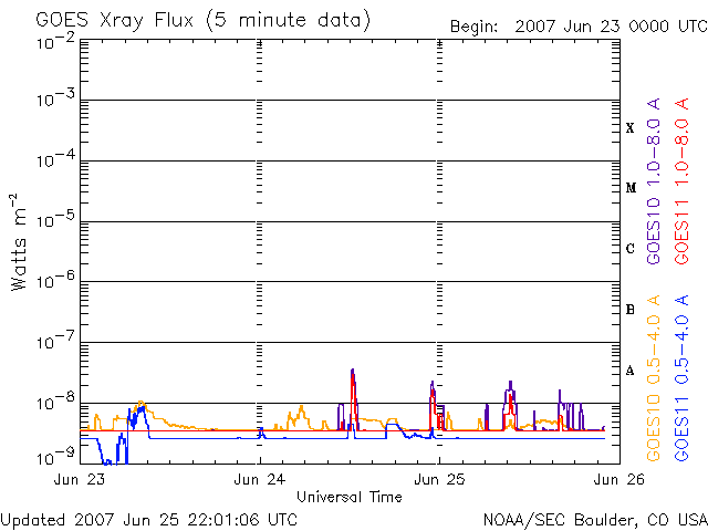 The operational data in the graph above has been modified to remove the scaling factor that has been applied by the Space Weather Prediction Center (SWPC). Because of the SWPC scaling factor in the operational data, flare indices for the operational data were reported as 42% smaller than for the science quality data. The scaling factor has also been removed from the solar flare list to reflect the true physical units.