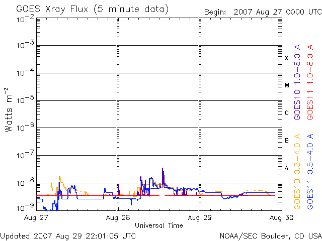 The operational data in the graph above has been modified to remove the scaling factor that has been applied by the Space Weather Prediction Center (SWPC). Because of the SWPC scaling factor in the operational data, flare indices for the operational data were reported as 42% smaller than for the science quality data. The scaling factor has also been removed from the solar flare list to reflect the true physical units.