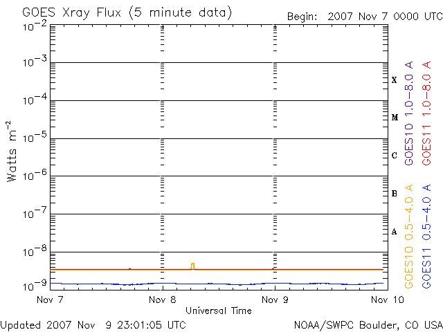 The operational data in the graph above has been modified to remove the scaling factor that has been applied by the Space Weather Prediction Center (SWPC). Because of the SWPC scaling factor in the operational data, flare indices for the operational data were reported as 42% smaller than for the science quality data. The scaling factor has also been removed from the solar flare list to reflect the true physical units.