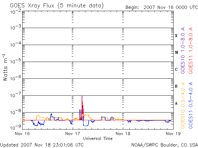The operational data in the graph above has been modified to remove the scaling factor that has been applied by the Space Weather Prediction Center (SWPC). Because of the SWPC scaling factor in the operational data, flare indices for the operational data were reported as 42% smaller than for the science quality data. The scaling factor has also been removed from the solar flare list to reflect the true physical units.