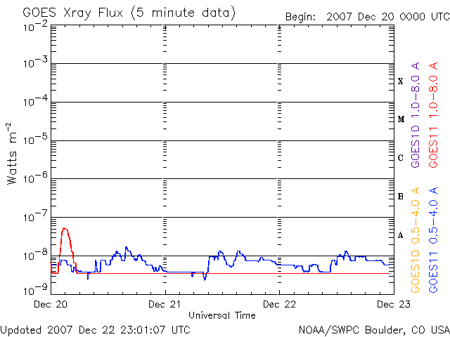 The operational data in the graph above has been modified to remove the scaling factor that has been applied by the Space Weather Prediction Center (SWPC). Because of the SWPC scaling factor in the operational data, flare indices for the operational data were reported as 42% smaller than for the science quality data. The scaling factor has also been removed from the solar flare list to reflect the true physical units.