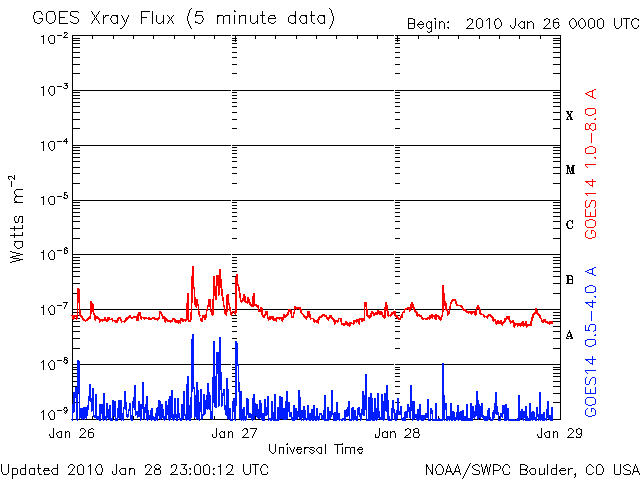 The operational data in the graph above has been modified to remove the scaling factor that has been applied by the Space Weather Prediction Center (SWPC). Because of the SWPC scaling factor in the operational data, flare indices for the operational data were reported as 42% smaller than for the science quality data. The scaling factor has also been removed from the solar flare list to reflect the true physical units.