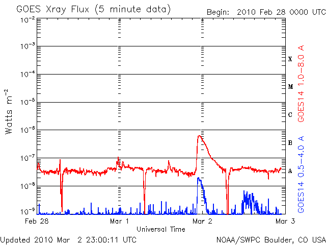 The operational data in the graph above has been modified to remove the scaling factor that has been applied by the Space Weather Prediction Center (SWPC). Because of the SWPC scaling factor in the operational data, flare indices for the operational data were reported as 42% smaller than for the science quality data. The scaling factor has also been removed from the solar flare list to reflect the true physical units.