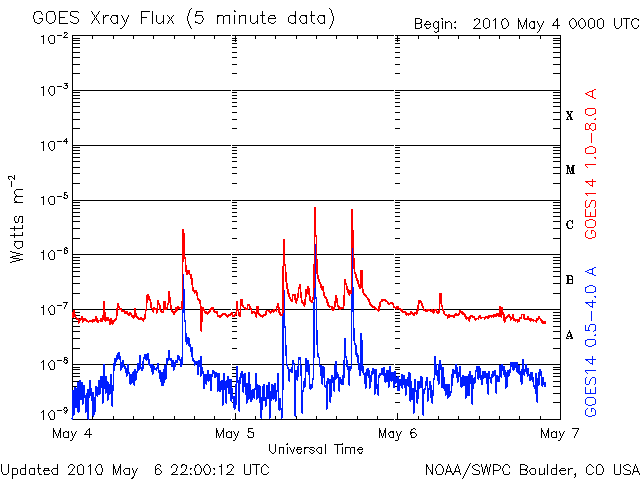The operational data in the graph above has been modified to remove the scaling factor that has been applied by the Space Weather Prediction Center (SWPC). Because of the SWPC scaling factor in the operational data, flare indices for the operational data were reported as 42% smaller than for the science quality data. The scaling factor has also been removed from the solar flare list to reflect the true physical units.