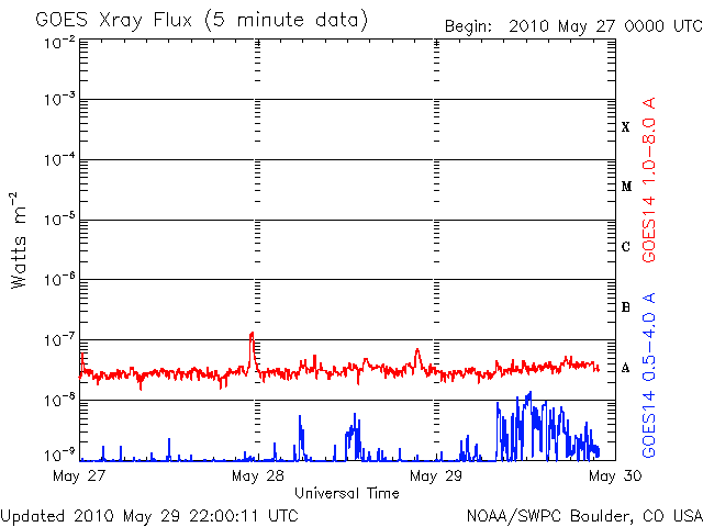The operational data in the graph above has been modified to remove the scaling factor that has been applied by the Space Weather Prediction Center (SWPC). Because of the SWPC scaling factor in the operational data, flare indices for the operational data were reported as 42% smaller than for the science quality data. The scaling factor has also been removed from the solar flare list to reflect the true physical units.