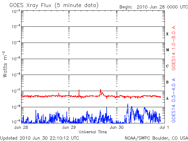 The operational data in the graph above has been modified to remove the scaling factor that has been applied by the Space Weather Prediction Center (SWPC). Because of the SWPC scaling factor in the operational data, flare indices for the operational data were reported as 42% smaller than for the science quality data. The scaling factor has also been removed from the solar flare list to reflect the true physical units.