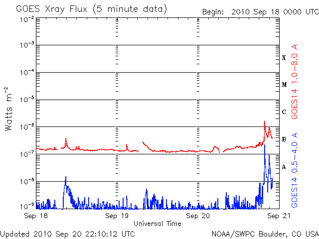 The operational data in the graph above has been modified to remove the scaling factor that has been applied by the Space Weather Prediction Center (SWPC). Because of the SWPC scaling factor in the operational data, flare indices for the operational data were reported as 42% smaller than for the science quality data. The scaling factor has also been removed from the solar flare list to reflect the true physical units.