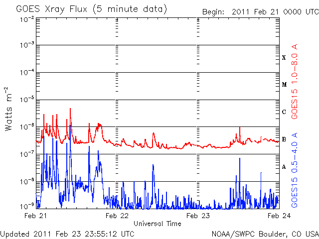 The operational data in the graph above has been modified to remove the scaling factor that has been applied by the Space Weather Prediction Center (SWPC). Because of the SWPC scaling factor in the operational data, flare indices for the operational data were reported as 42% smaller than for the science quality data. The scaling factor has also been removed from the solar flare list to reflect the true physical units.
