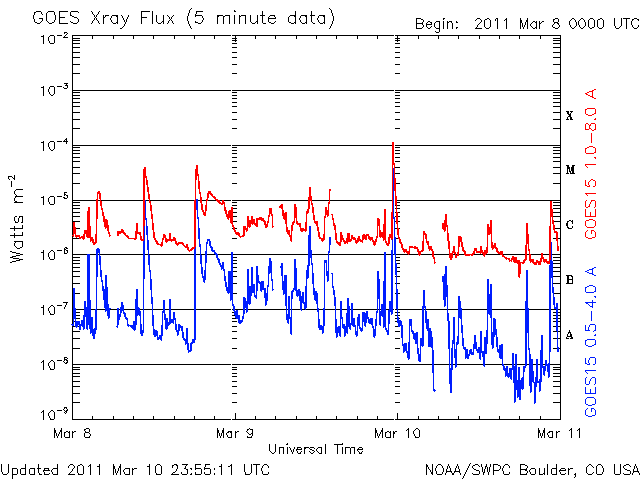 The operational data in the graph above has been modified to remove the scaling factor that has been applied by the Space Weather Prediction Center (SWPC). Because of the SWPC scaling factor in the operational data, flare indices for the operational data were reported as 42% smaller than for the science quality data. The scaling factor has also been removed from the solar flare list to reflect the true physical units.