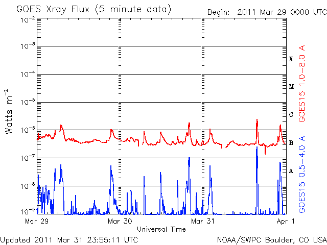 The operational data in the graph above has been modified to remove the scaling factor that has been applied by the Space Weather Prediction Center (SWPC). Because of the SWPC scaling factor in the operational data, flare indices for the operational data were reported as 42% smaller than for the science quality data. The scaling factor has also been removed from the solar flare list to reflect the true physical units.